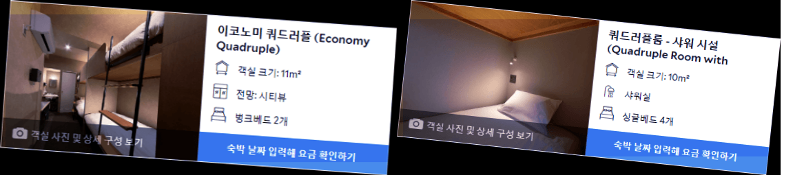 우리는 4인 가족이라 4인실을 예약했는데, 2층 침대가 있어 각자 편안하게 지낼 수 있었습니다. 방에는 화장실이 있었고 샤워실은 공용이었습니다. 처음에는 공용 샤워실에 불편함이 있을까 걱정했지만, 다른 투숙객과 마주칠 일도 없었고 저희들만 편히 사용할 수 있었습니다. 샤워실에는 모든 용품이 갖춰져 있어서 불편함이 없었습니다.